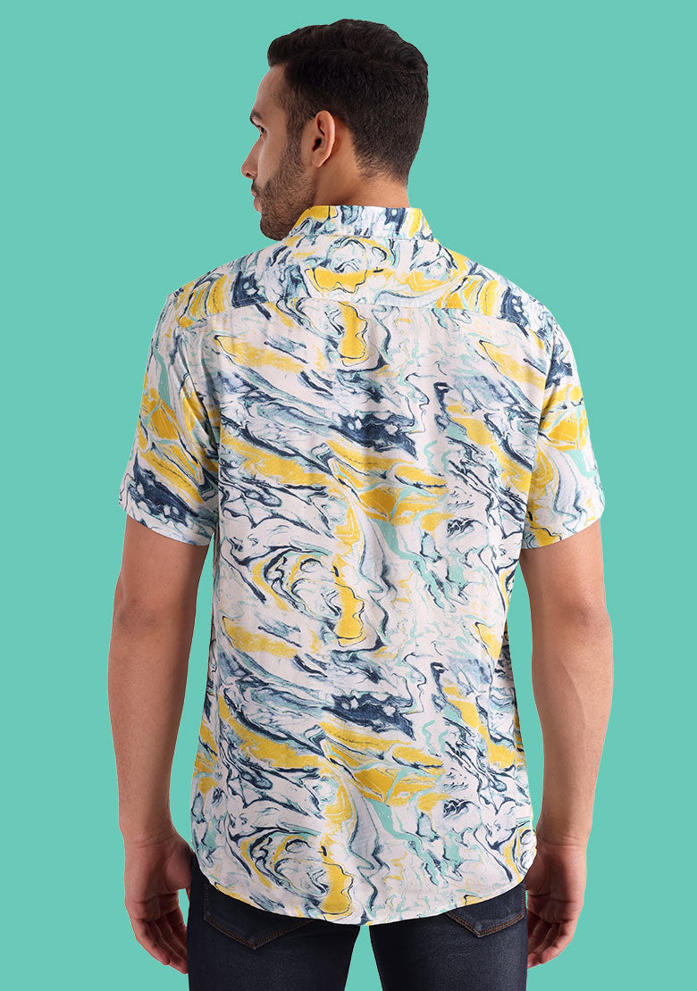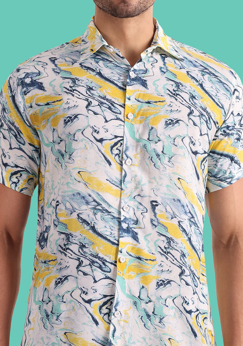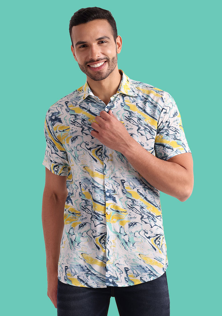 The shirt has a button closure for ease of wearing and removal. The printed pattern adds a bold and stylish touch to the shirt, making it stand out from the crowd. The breathable Viscose Rayon fabric is perfect for summer weather, ensuring that you stay comfortable and fresh all day long.