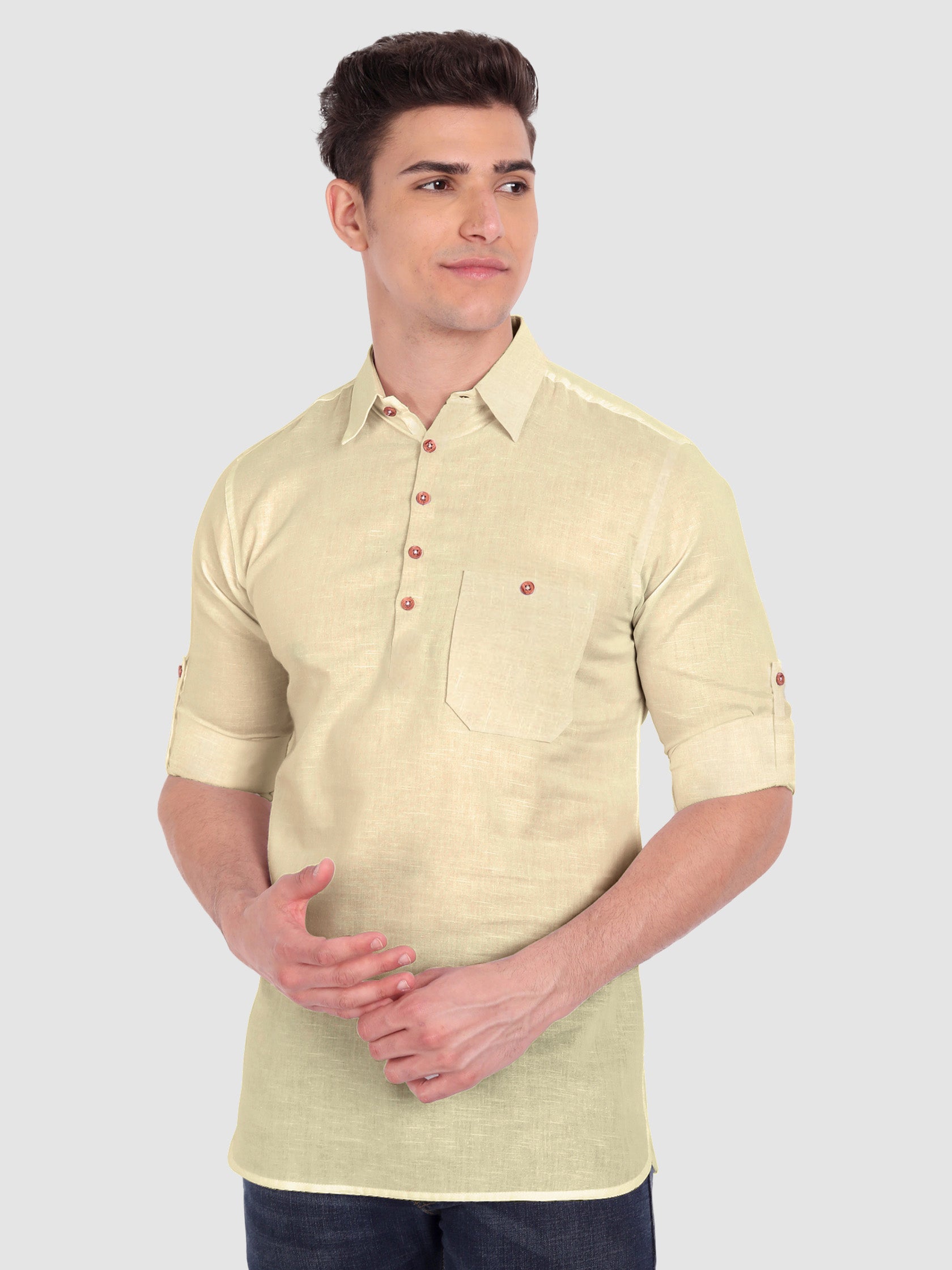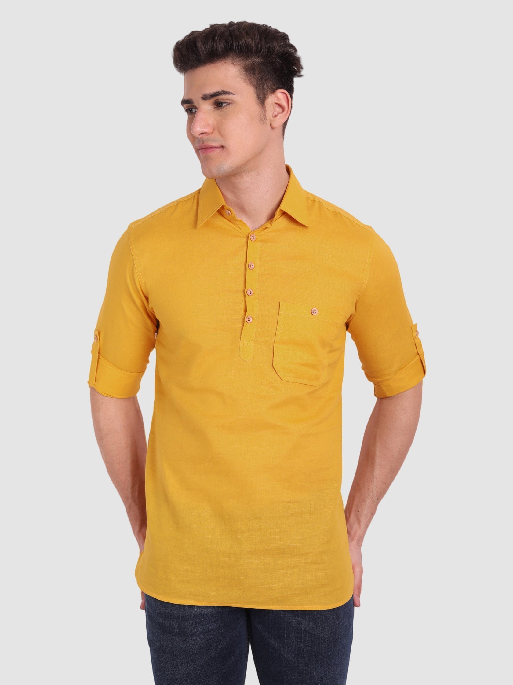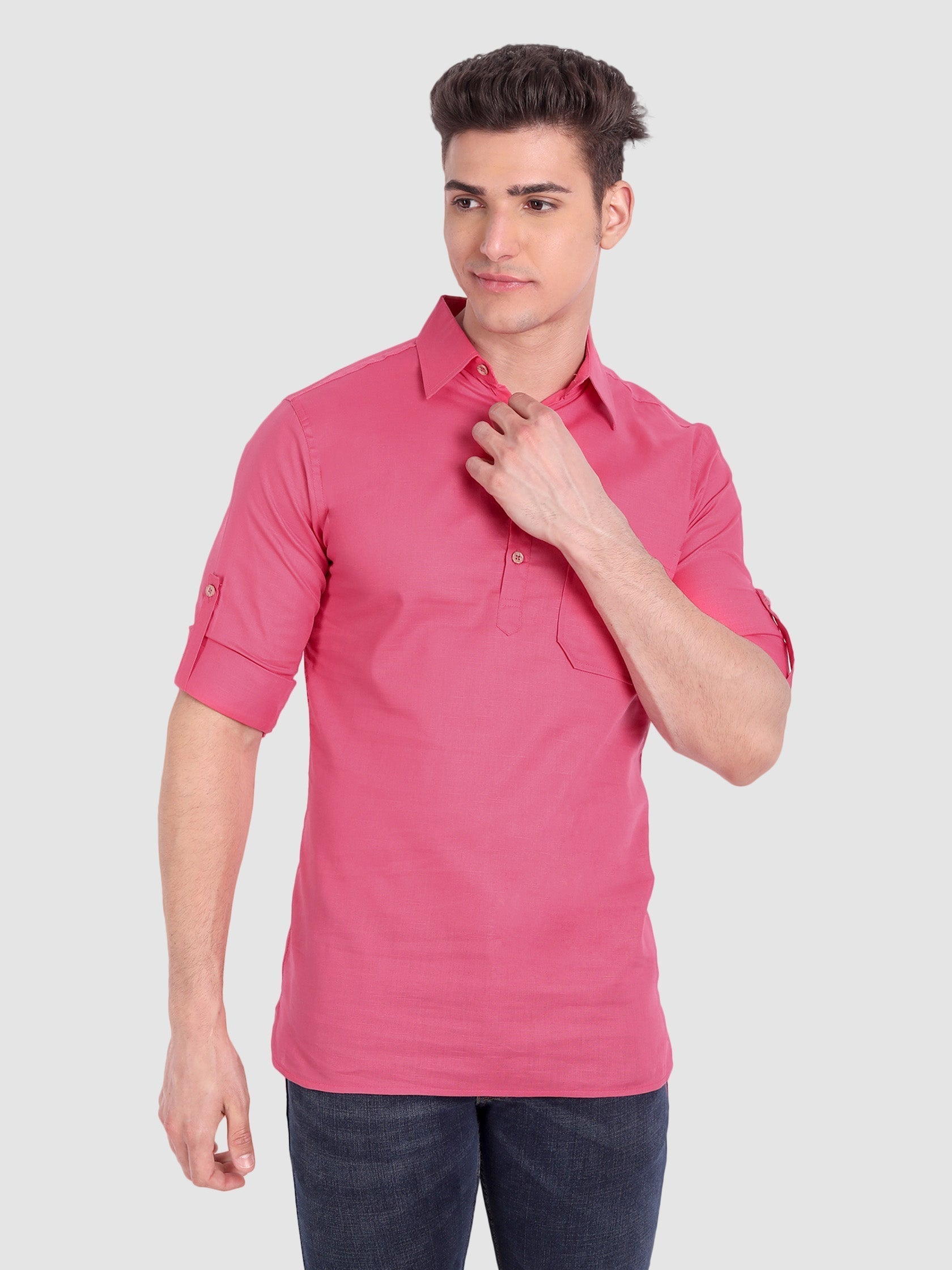This Men's Full Sleeve Casual Cotton Short Kurta is a stylish and comfortable piece of clothing that is perfect for any casual occasion. Made with 100% cotton fabric, it is soft and breathable, making it ideal for all-day wear. The curved hemline and spread collar give it a smart and sophisticated look, while the button closure ensures a comfortable and secure fit. The full roll-up style sleeves make it easy to adjust the length of the sleeves to suit your preference, and the left pocket adds a practical touch. Available in various colors and sizes, this kurta is a versatile piece that will quickly become a staple in your wardrobe. And with its easy-to-follow wash care instructions, it is also low-maintenance, making it the perfect choice for busy, on-the-go guys.